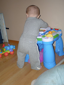 He's much more interested in walking than crawling. He stands at the ottoman to the glider rocker and pushes it around the room. And, with a little help, stands at his Baby Einstein music table and pushes all the buttons.