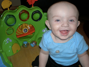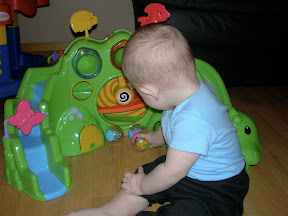 Grandma sent Braxton the fabulous Fisher-Price Rock & Roar Dinosaur. He's a tiny bit young for it, but I'm sure he'll catch on very quickly.